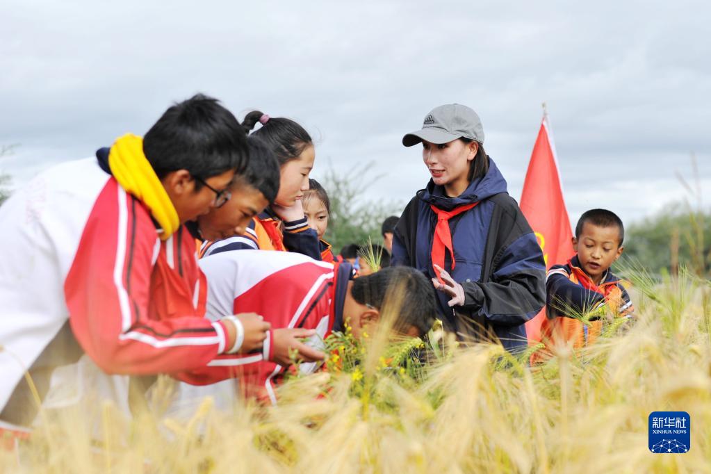 日喀則市上海實驗學校的學生們在青稞地里聽講解(9月17日攝)。新華社發(fā)(潘杰 攝)