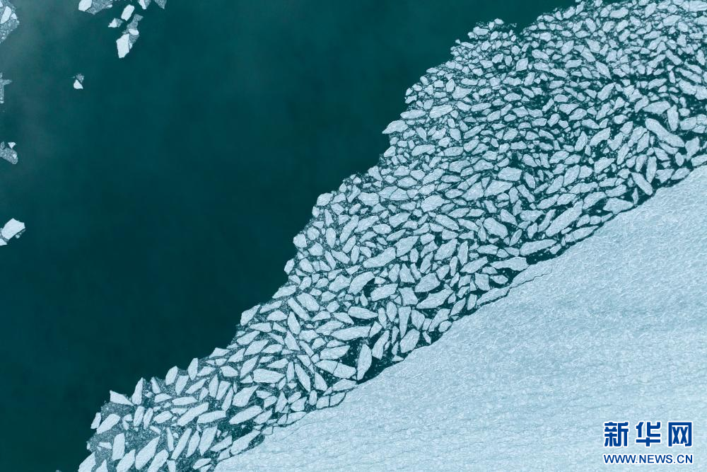 1月29日拍攝的瑪旁雍錯湖面上的冰堆積在一起,呈現(xiàn)出各式各樣的造型(無人機照片)。新華網(wǎng) 旦增努布 攝
