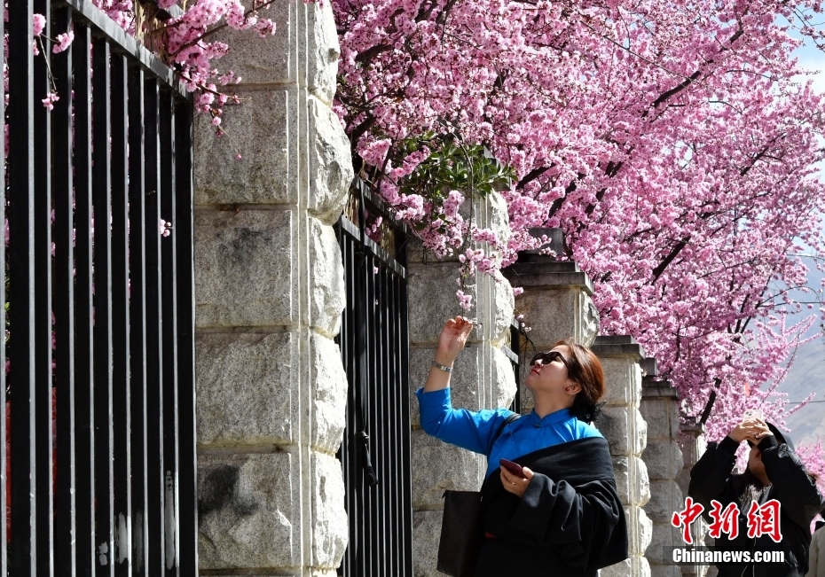 4月1日,市民在春花綻放的道路旁賞花。隨著雪域高原天氣回暖,西藏拉薩市區(qū)各條道路春花綻放。因道路兩側(cè)繁華似錦,拉薩市城關(guān)區(qū)軍民路成網(wǎng)紅打卡地,市民游客紛紛前來打卡拍照。