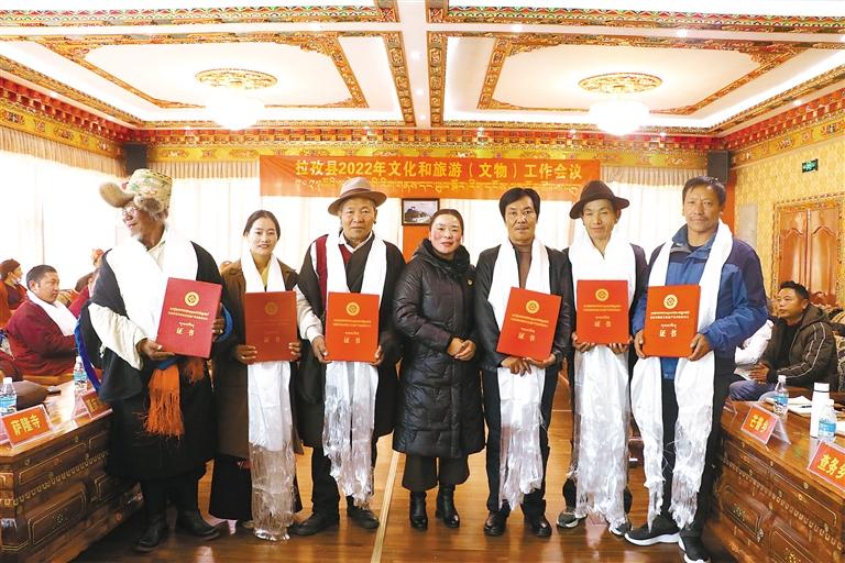 會議總結(jié)了拉孜縣2021年度文化和旅游(文物)相關(guān)工作,向8家文化企業(yè)發(fā)放了市級文化產(chǎn)業(yè)示范基地牌子;7支藏戲隊發(fā)放藏戲傳習(xí)點牌子;30家文保單位發(fā)放了文保單位全景圖;8名非遺傳承人發(fā)放了非遺傳承人證書。