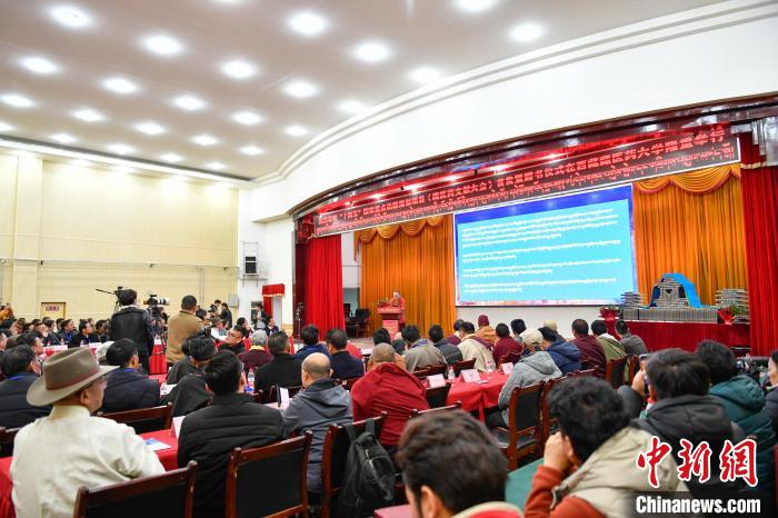圖為《藏醫(yī)藥文獻大全》首發(fā)暨贈書儀式現(xiàn)場。貢嘎來松 攝
