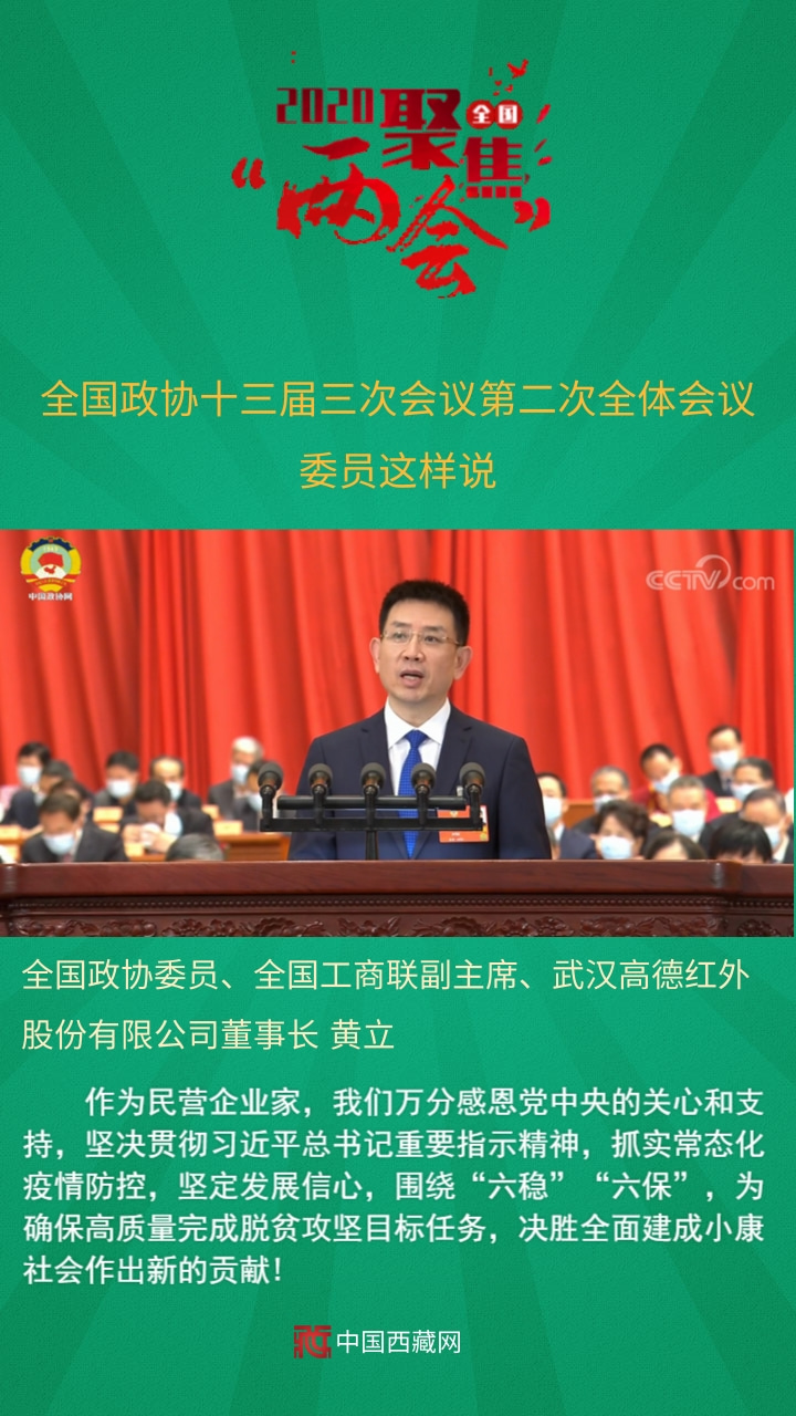全國(guó)政協(xié)委員、全國(guó)工商聯(lián)副主席、武漢高德紅外股份有限公司董事長(zhǎng)黃立發(fā)言說(shuō),作為民營(yíng)企業(yè)家,我們?nèi)f分感恩黨中央的關(guān)心和支持,堅(jiān)決貫徹習(xí)近平總書(shū)記重要指示精神,抓實(shí)常態(tài)化疫情防控,堅(jiān)定發(fā)展信心,圍繞“六穩(wěn)”“六?!保瑸榇_保高質(zhì)量完成脫貧攻堅(jiān)目標(biāo)任務(wù),決勝全面建成小康社會(huì)作出新的貢獻(xiàn)!