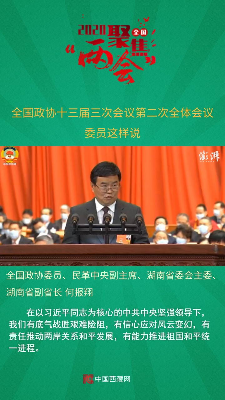 全國(guó)政協(xié)委員、民革中央副主席、湖南省委會(huì)主委、湖南省副省長(zhǎng)何報(bào)翔發(fā)言說(shuō),在以習(xí)近平同志為核心的中共中央堅(jiān)強(qiáng)領(lǐng)導(dǎo)下,我們有底氣戰(zhàn)勝艱難險(xiǎn)阻,有信心應(yīng)對(duì)風(fēng)云變幻,有責(zé)任推動(dòng)兩岸關(guān)系和平發(fā)展,有能力推進(jìn)祖國(guó)和平統(tǒng)一進(jìn)程。