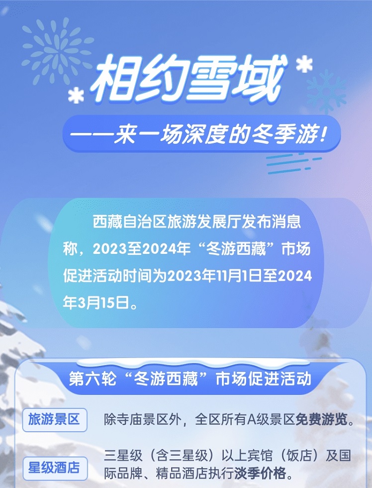 西藏自治區(qū)旅游發(fā)展廳發(fā)布消息稱,2023至2024年“冬游西藏”市場促進(jìn)活動時間為2023年11月1日至2024年3月15日。[詳細(xì)]
