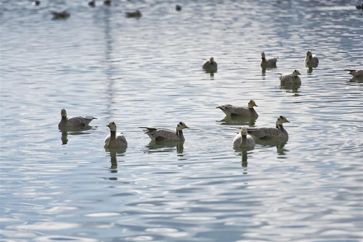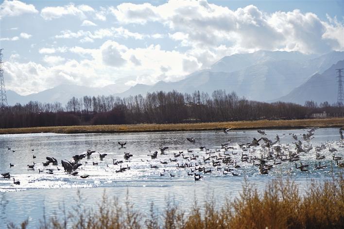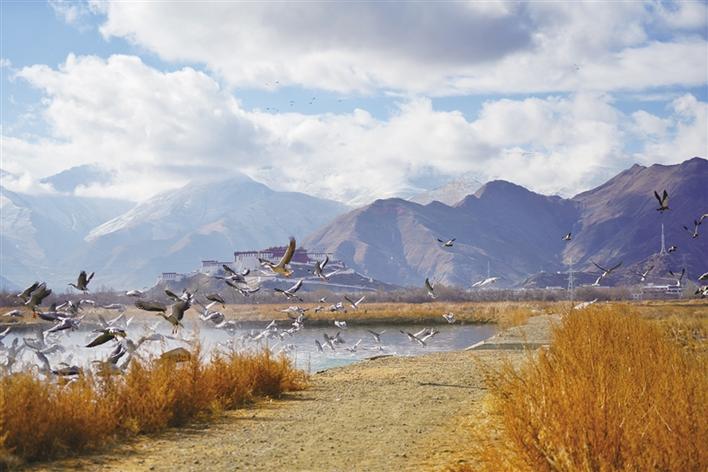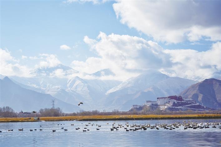 遠(yuǎn)處,連綿起伏的山頂還覆蓋著薄薄的積雪,布達(dá)拉宮雄偉而秀美;近處,濕地內(nèi)隨意顯現(xiàn)出的一塊塊水泊,成群的候鳥在水中玩耍嬉戲、在藍(lán)天白云下飛舞。見到可愛的飼養(yǎng)員帶來(lái)它們喜歡的麥粒,斑頭雁、紅隼、赤麻鴨、黃鴨等紛紛游上岸來(lái),盡情地享受美食,發(fā)出歡快的叫聲。