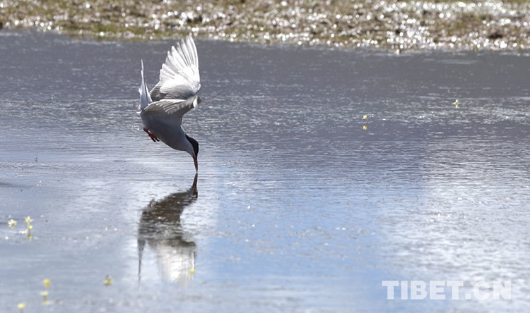 圖為一只鳥(niǎo)兒在納木措湖畔水域覓食 攝影:王媛媛