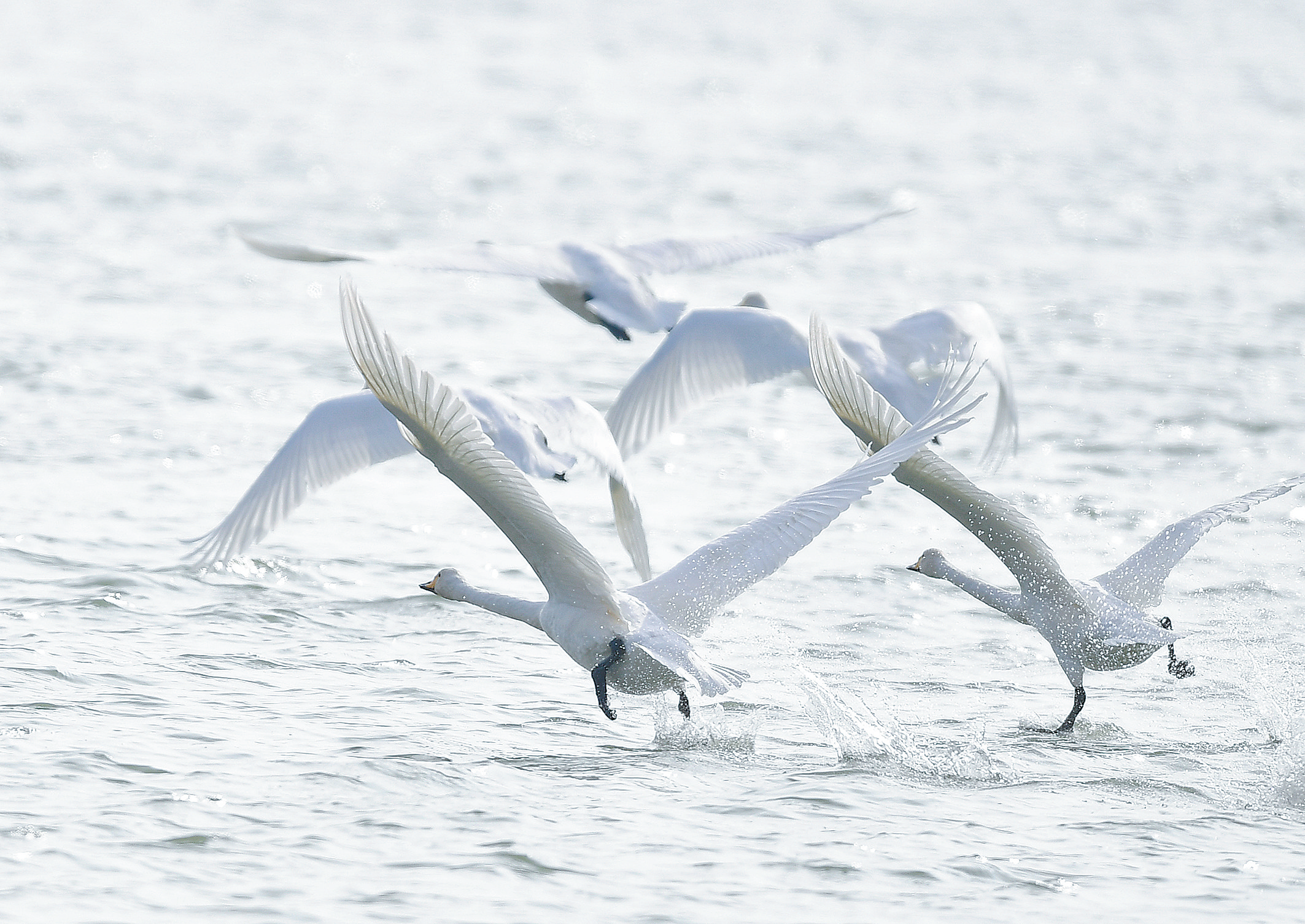在青海省海東市化隆回族自治縣,天鵝翔集黃河邊,帶來(lái)冬日里的勃勃生機(jī)。