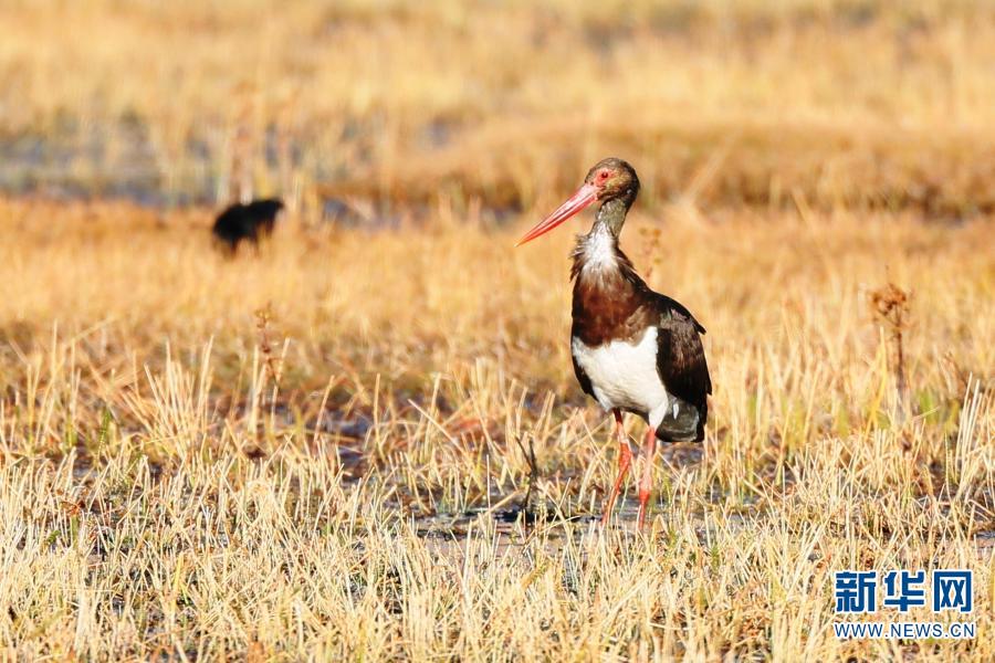 這是11月20日在云南省香格里拉市納帕海國際重要濕地拍攝的黑鸛。新華社 陳志明 攝