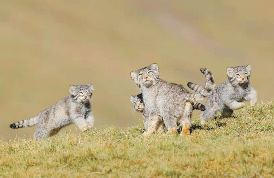這和諧的場面沒持續(xù)多久就被遠(yuǎn)處虎視眈眈的藏狐打破了。兔猻媽媽警惕地盯著藏狐,發(fā)出短促的警報(bào)聲,三只小兔猻聽到媽媽的聲音后便奔跑回洞穴。攝影師迅速按下快門,優(yōu)秀攝影作品《當(dāng)媽媽說跑步前進(jìn)》由此誕生。