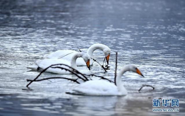 1月22日,大天鵝在青海省貴德縣境內的黃河中覓食。新華社記者 張宏祥 攝