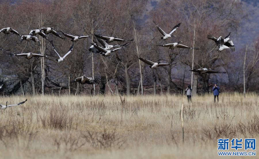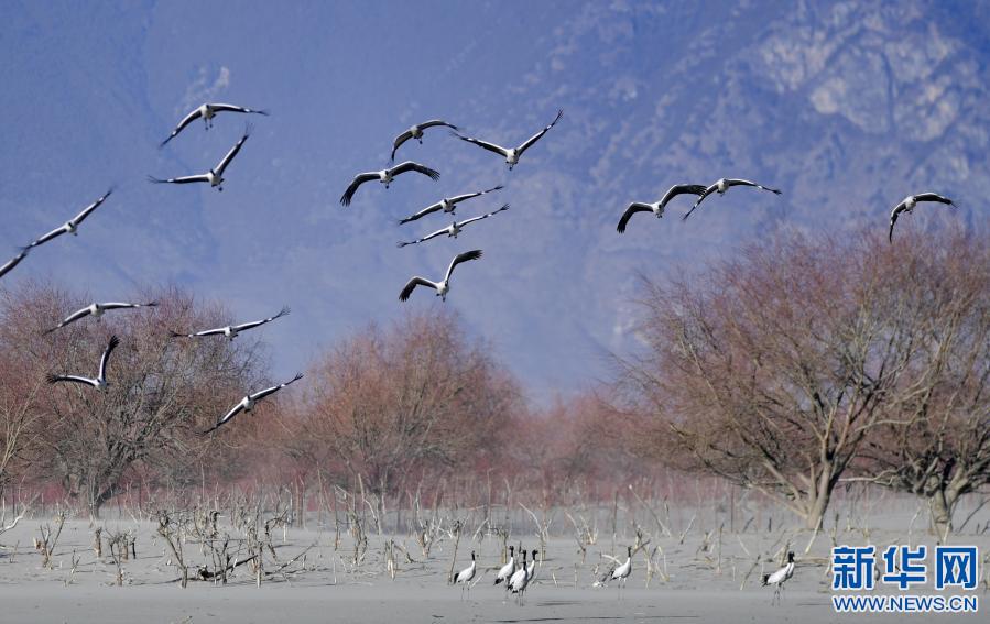 冬季,成群結(jié)隊(duì)的黑頸鶴遷徙到西藏林芝市,雅魯藏布江及江畔的農(nóng)田成了它們?cè)蕉臉穲@。