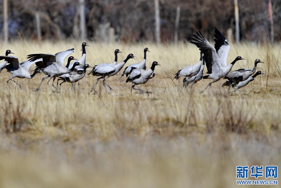 林芝市米林縣農(nóng)田里的黑頸鶴(2月1日攝)。新華社記者 張汝鋒 攝