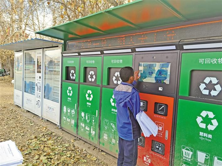 記者在林周縣城部分小區(qū)和學(xué)校內(nèi)看到,安裝的智能垃圾分類設(shè)備已全部投入使用,智能分類回收箱箱體上標(biāo)注著“紙張”“塑料”“金屬”等各類名稱。學(xué)生們只要在設(shè)備端口掃描校園班級卡上的二維碼,把廢紙、塑料瓶等垃圾依次分類放入“智能回收箱”,垃圾分類箱便會根據(jù)投放的垃圾自動稱重計(jì)算積分,并在學(xué)生的校園班級卡賬戶上增加相應(yīng)的“垃圾兌換積分”,使用積分就可以在平臺兌換作業(yè)本、紙筆等學(xué)習(xí)用品。