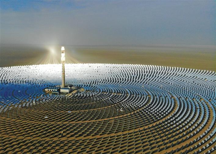 在甘肅省敦煌市向西約20公里處,被稱為“超級(jí)鏡子發(fā)電站”的首航高科敦煌100兆瓦熔鹽塔式光熱電站在戈壁灘上閃耀(2021年2月24日攝,無(wú)人機(jī)照片)。新華社記者 馬希平 攝