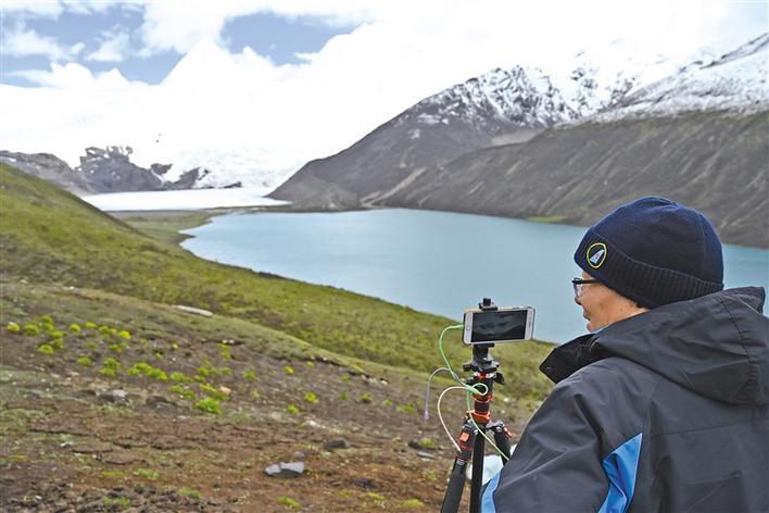 6月9日,來自湖南的孫先生在拍攝薩普雪山。記者 王藝霏 拉巴卓瑪 曲珍 攝