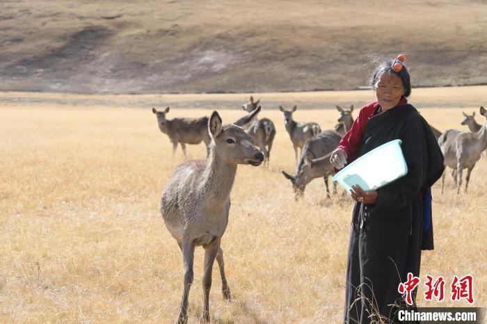 圖為和馬鹿打了一輩子交道的藏族阿媽向秋拉姆正在喂食馬鹿。 冉文娟 攝