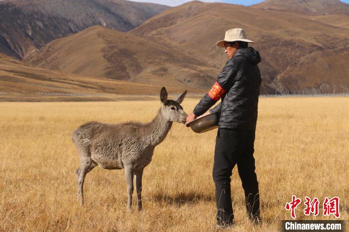 圖為西藏類烏齊馬鹿國(guó)家級(jí)自然保護(hù)區(qū)的管護(hù)員正在飼喂馬鹿?!∪轿木?攝
