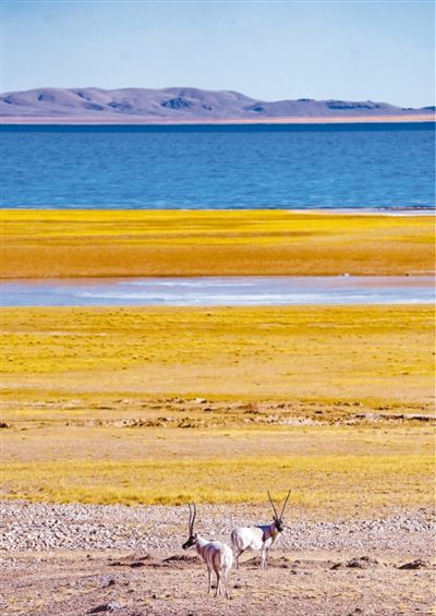 圖為藏羚羊在位于西藏那曲市的色林錯(cuò)湖畔。
