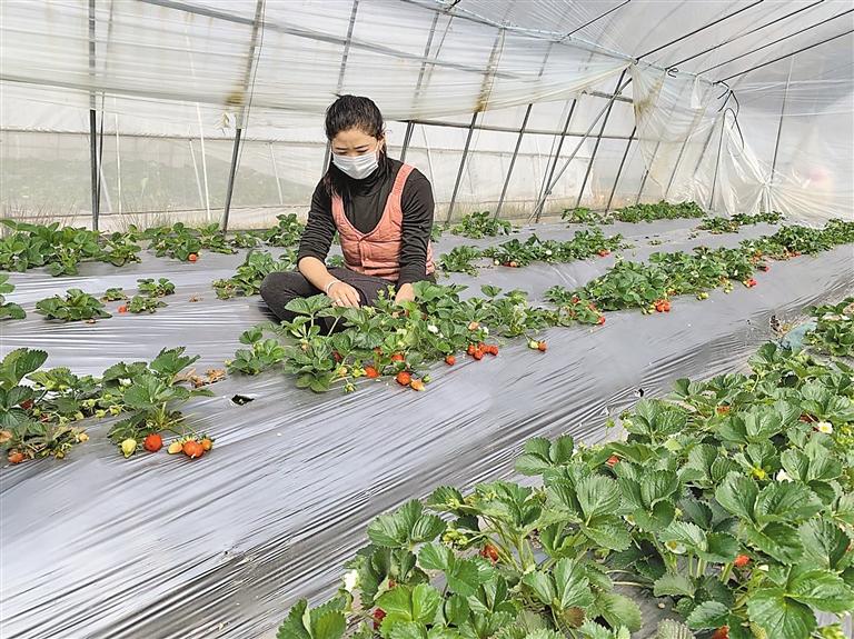 圖為巴宜區(qū)更章鄉(xiāng)久巴村村民白瑪卓瑪在打理草莓大棚。 記者 胡文 攝