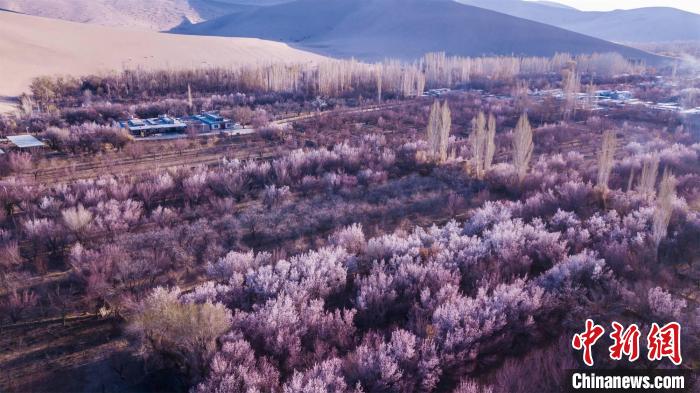 2022年3月30日,航拍敦煌鳴沙山下的李廣杏花海?!⊥醣筱y 攝