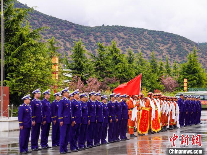 林芝市森林消防支隊(duì)營(yíng)區(qū)人員列隊(duì)歡迎駐防分隊(duì)歸來(lái)?!±顕?guó)燾 攝