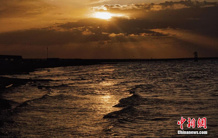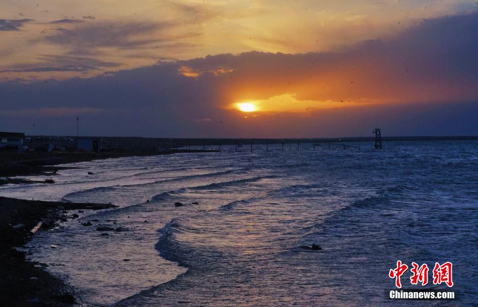 圖為夕陽下的青海湖。