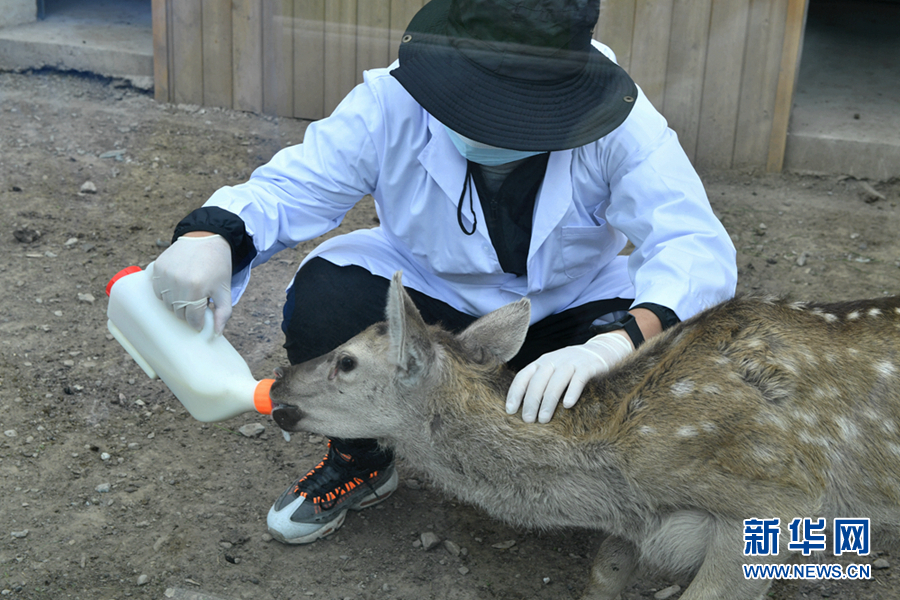在祁連山國(guó)家公園青海片區(qū)野生動(dòng)物救護(hù)繁育中心內(nèi),工作人員正在給馬鹿喂奶。新華網(wǎng) 卡婭梅朵 攝