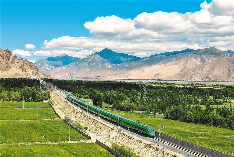 中央支持西藏自治區(qū)基本建成涵蓋公路、鐵路、航空、管道等多種運輸方式的綜合立體交通網(wǎng)絡。2021年6月25日,川藏鐵路拉林段正式開通運營。圖為開通當日,復興號高原內電雙源動車組首次開上青藏高原。