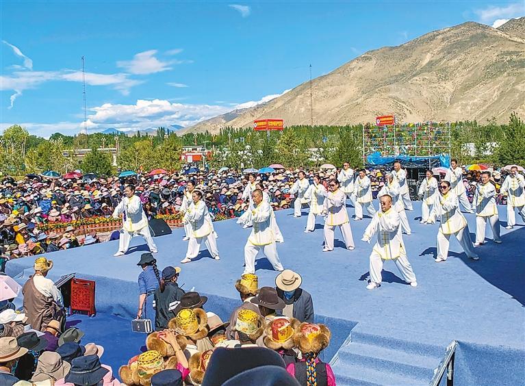 西藏自治區(qū)山南市各族太極拳愛(ài)好者進(jìn)行傳統(tǒng)楊氏太極拳表演。