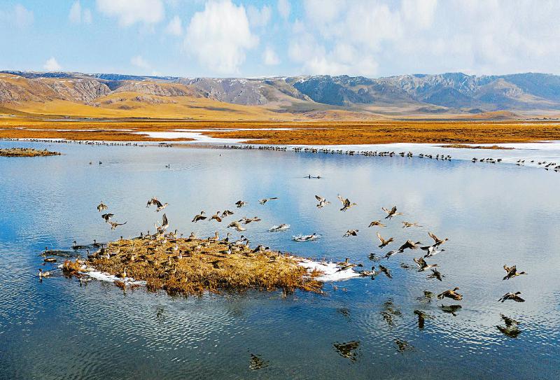 雪后陽(yáng)光下,數(shù)千只飛禽在若爾蓋花湖嬉戲翱翔。 四川日?qǐng)?bào)全媒體記者 尹鋼 攝(資料圖片)