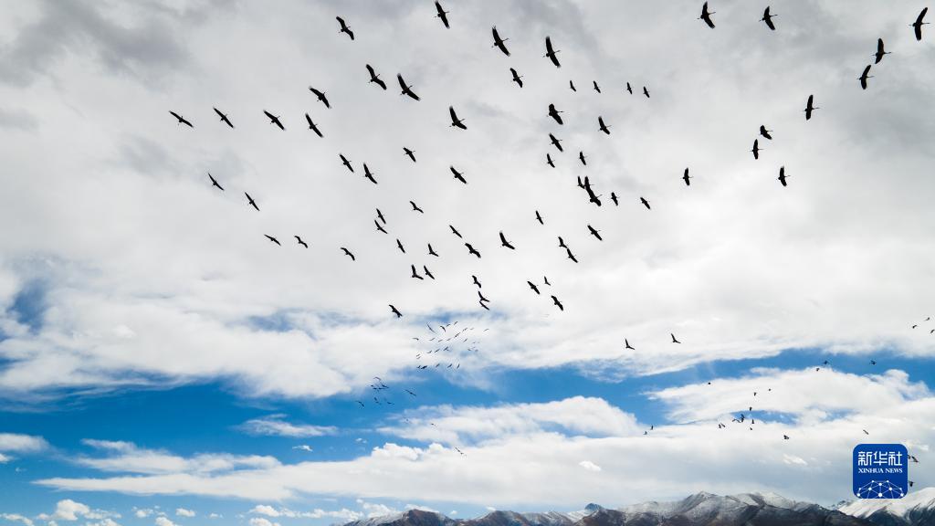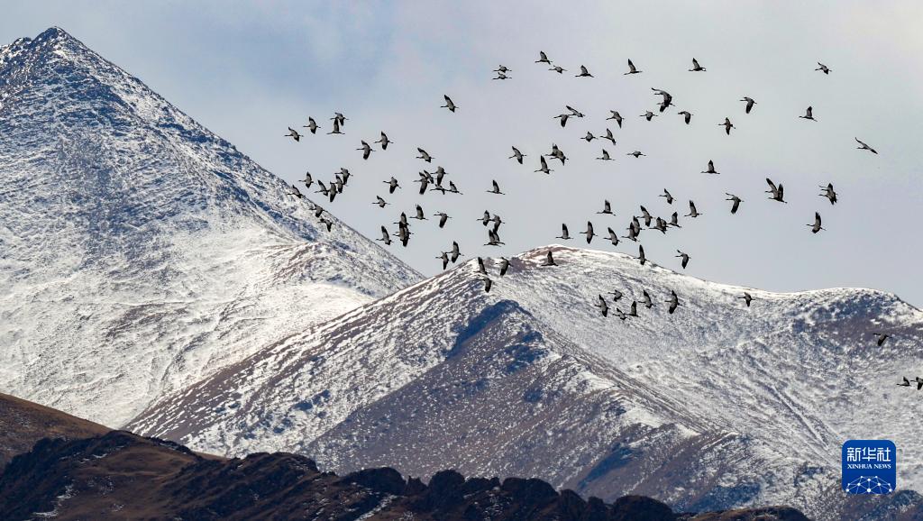 黑頸鶴群飛過林周縣強(qiáng)嘎鄉(xiāng)境內(nèi)山梁(11月6日攝)。新華社記者 姜帆 攝