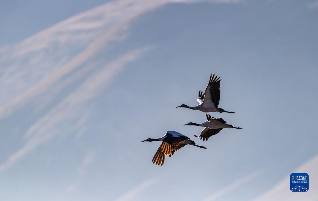黑頸鶴在林周縣黑頸鶴自然保護(hù)區(qū)上空盤旋(11月6日攝)。新華社記者 張汝鋒 攝