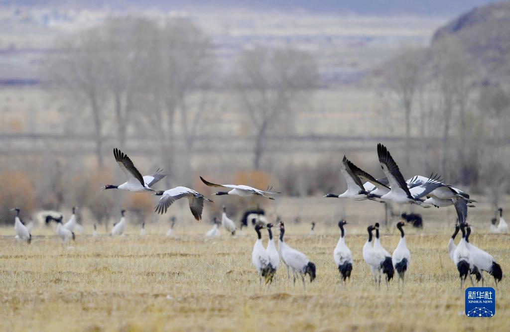 林周縣強(qiáng)嘎鄉(xiāng)田野里的黑頸鶴(11月6日攝)。新華社記者 張汝鋒 攝