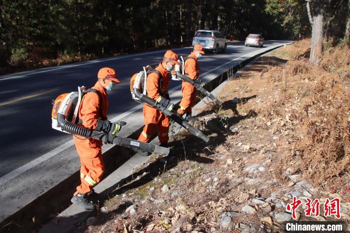 消防隊員利用風(fēng)力滅火機(jī)收攏國道旁可燃物?!⊥鯘蓷?攝