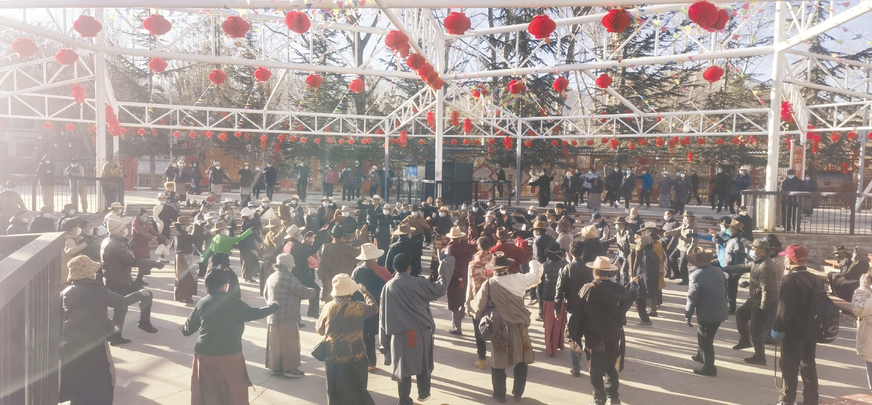 上午10時,在宗角祿康公園內(nèi)的圓形舞臺上,一場象征歡樂團結(jié)、幸福美滿的鍋莊舞熱鬧開場。伴隨著優(yōu)美動聽的樂曲,各族群眾圍成數(shù)個大圈,邁開步子,揮舞臂膀,跳起富有藏民族特色的鍋莊舞,令清晨的拉薩充滿了生機與活力,舞出了市民群眾幸福的心聲及對生活的熱愛向往。