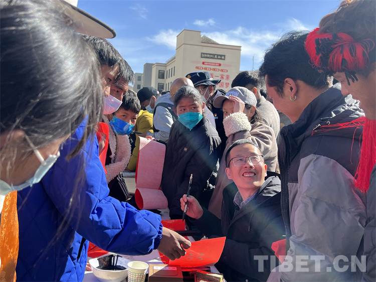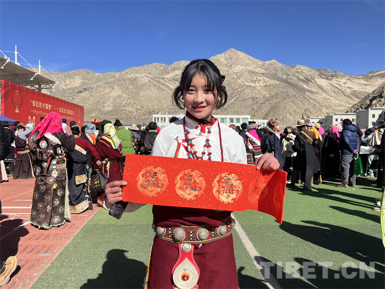 來到送“書法”現(xiàn)場,書法家們早早地來到活動現(xiàn)場,他們準(zhǔn)備筆墨、鋪開紙張,為現(xiàn)場群眾書寫藏、漢文新年對聯(lián),“?!弊帧ⅰ凹槿缫狻?、“扎西德勒”等寓意美好的祝福。書法家協(xié)會副主席祖牛拉巴次仁說:“從春節(jié)開始,我們書法家們?nèi)W(xué)校、社區(qū)、搬遷安置點等地,書寫了超過1萬件的書法作品。這些作品深受大家的喜愛,我們后續(xù)也會繼續(xù)開展送‘書法’公益活動”。現(xiàn)場群眾聚集在送“書法”現(xiàn)場,“西熱措姆”“張文青”“索朗旺青”“朗嘎達瓦”……孩子們爭先恐后請書法家把自己的名字寫在紅紙上?!斑@是我的名字,我爸是西寧人,我媽是那曲的,我們是從那曲安多縣搬遷過來的,我現(xiàn)在在森布日幸福中學(xué)上初三,將來要考那曲高級中學(xué)”張文青拿著書家贈給她的“名字”用流利的那曲話對記者說。