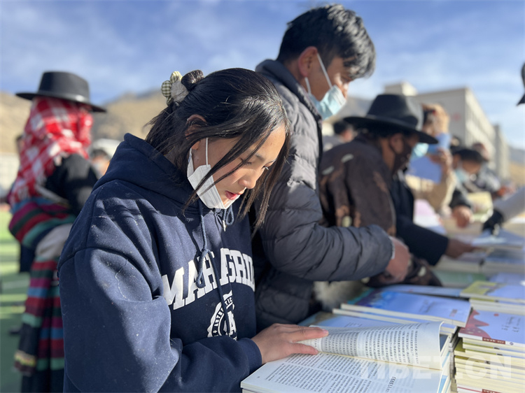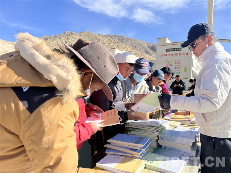 在送“書籍” 現(xiàn)場,《西藏文學(xué)》《西藏文藝》《邦錦梅朵》三個編輯部工作人員為現(xiàn)場群眾和當(dāng)?shù)馗刹抠浰蜁?,?dāng)?shù)厝罕姾蛯W(xué)生們紛紛前來翻看尋找自己喜歡的書籍,大家人手幾本書?!拔移綍r喜歡閱讀藏文文學(xué)作品,這次要了兩本文學(xué)相關(guān)書籍拿回家閱讀”17歲的益西巴珍說。據(jù)了解,此次活動西藏文聯(lián)向熱愛閱讀的群眾和學(xué)生共贈送1500本(冊)文藝書籍和期刊。