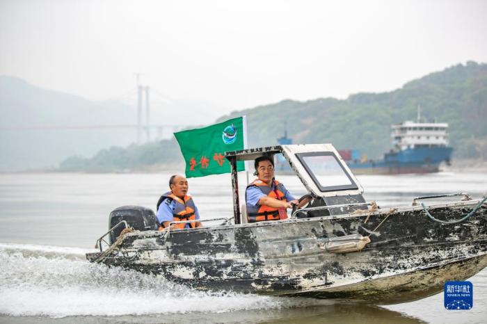 鴻鵠護(hù)魚志愿隊隊長劉鴻(右)帶領(lǐng)隊員在長江重慶江津段巡護(hù)(2022年9月2日攝)。新華社記者 黃偉 攝