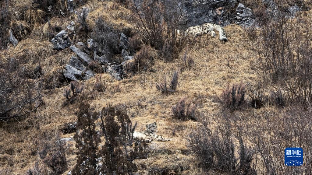 2月21日,在青海省玉樹(shù)藏族自治州雜多縣昂賽鄉(xiāng)境內(nèi)的昂賽大峽谷內(nèi),兩只雪豹正在休息。新華社記者 張宏祥 攝