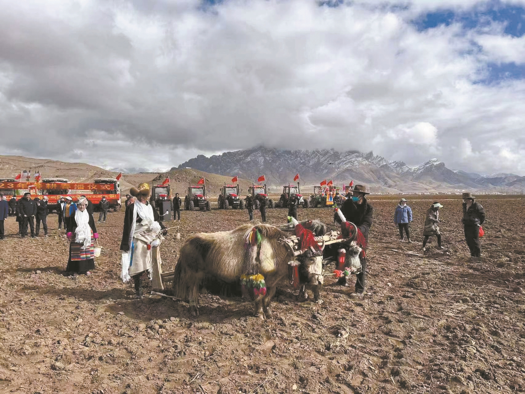 人勤春來(lái)早,功到秋華實(shí)。林周縣強(qiáng)嘎鄉(xiāng)強(qiáng)嘎村,一年一度盛大的春耕春播儀式正在進(jìn)行。身著盛裝的農(nóng)牧民群眾,駕駛著一臺(tái)臺(tái)由國(guó)旗、彩旗、花束裝點(diǎn)的拖拉機(jī),犁開沉寂了一冬的土地,將希望的種子撒向田野。明媚的春光里,雪域高原拉開春耕春播的帷幕。