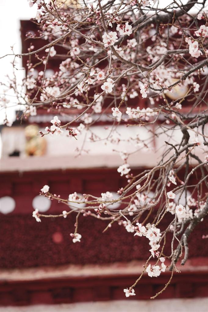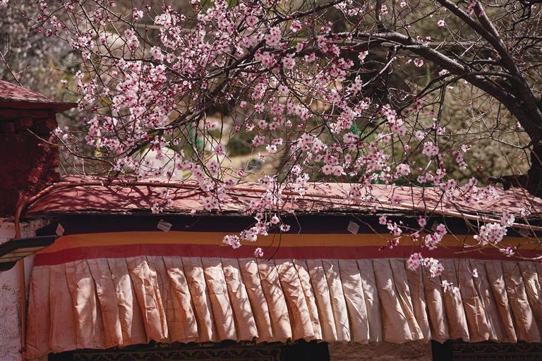 4月的帕邦喀,桃花開(kāi)得正茂,桃樹(shù)枝上早已經(jīng)掛滿(mǎn)了大大小小的花朵,沿著石板臺(tái)階走走停停,可以看到桃樹(shù)舒展枝條,朵朵桃花爬上枝頭沐浴著春日的暖陽(yáng),在藍(lán)天白云、紅墻金頂?shù)挠骋r之下格外美麗,構(gòu)成一幅絕妙的春景詩(shī)畫(huà)。偶爾枝頭傳來(lái)清脆的鳥(niǎo)鳴聲,讓這里顯得愈發(fā)靜謐美好。
