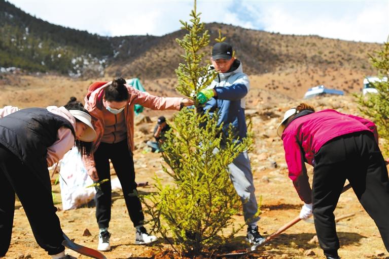 揮鍬鏟土、扶正樹苗、培土圍堰、提水澆灌,植樹現(xiàn)場一派熱火朝天的景象。大家一邊勞動,一邊與現(xiàn)場林草部門的同志交流,詳細了解西藏國土綠化、生態(tài)保護等情況,認真學習各類苗木習性、生長周期、管理養(yǎng)護等知識。經(jīng)過2個多小時奮戰(zhàn),400多棵油松、樟子松、海棠等樹木錯落有致、迎風挺立,為山坡更添勃勃生機。