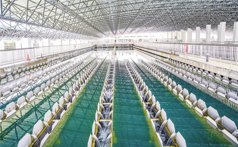 為了解居民的生活用水如何從大自然被搬運到千家萬戶,記者驅(qū)車來到納金水廠一探究竟。據(jù)納金水廠副廠長申雅薈介紹,納金水廠于2016年開始籌建,2019年投入使用,是一座高原規(guī)模最大、最具標志意義的地表水廠。廠區(qū)建設(shè)用地面積為182.8畝,設(shè)計供水能力48萬立方米/日,輸配水管道132.2千米。目前,納金水廠作為主供水源為全市供水,平均日供水量為41萬立方米,承擔了全市約90%的供水重任。