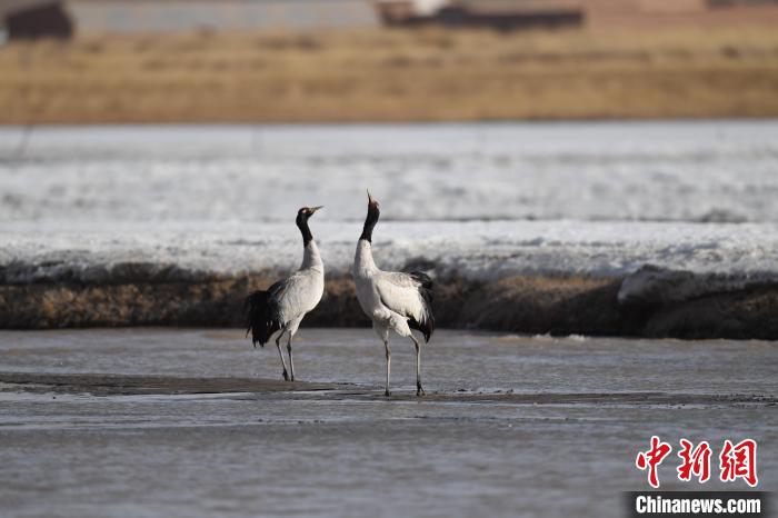 圖為一對成體黑頸鶴在黨河濕地嬉戲。(資料圖) 受訪者供圖
