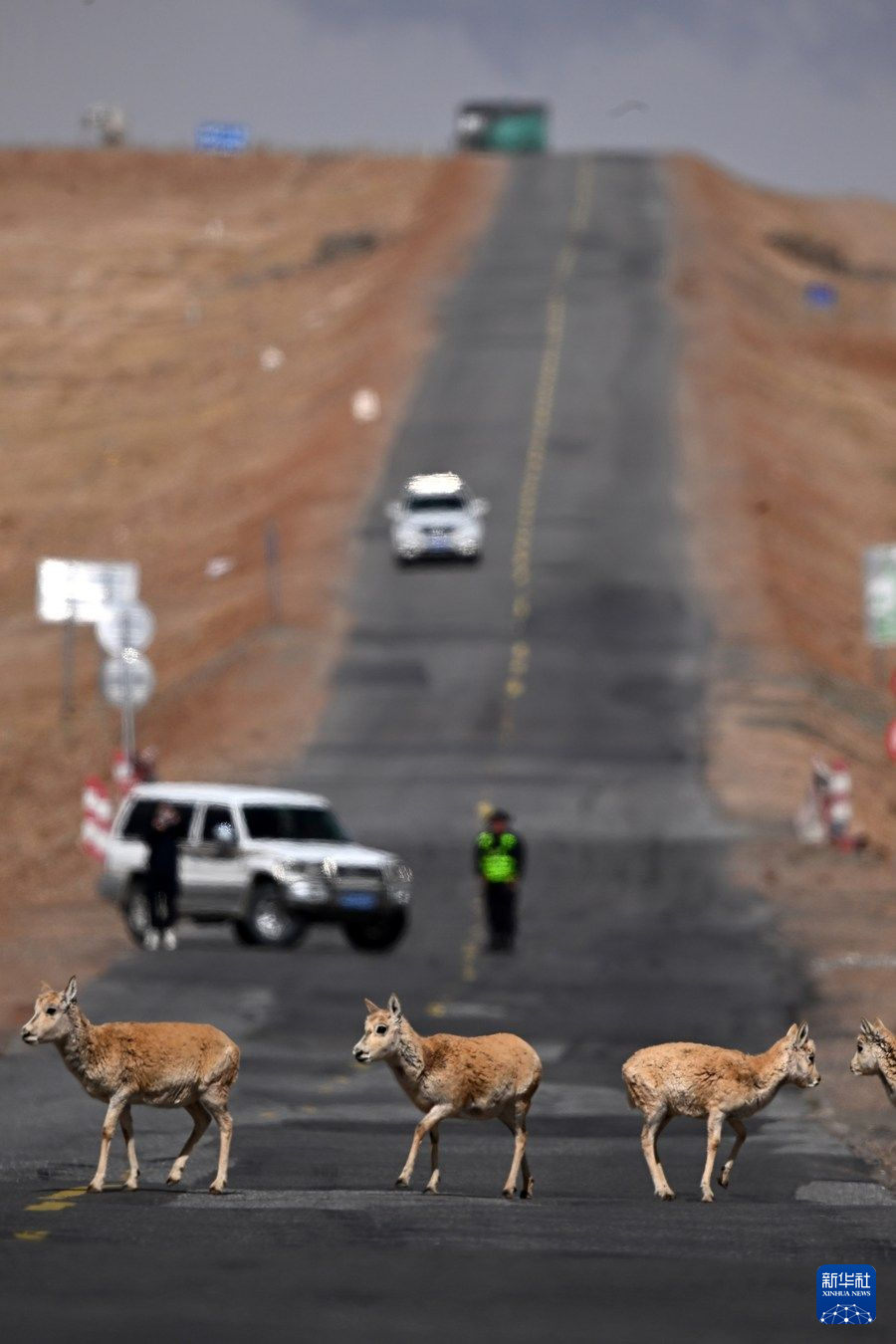 眼下,可可西里藏羚羊進入遷徙產(chǎn)仔高峰期,記者近日在青藏公路3001公里處看到,成群的雌性藏羚羊在公路一側(cè)集結(jié),現(xiàn)場的工作人員對往來車輛進行臨時交通管制。頭羊反復(fù)試探、確認沒有危險后,羊群快速通過公路,向可可西里腹地奔去。
