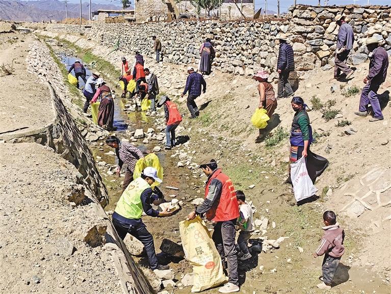 圖為干部職工和環(huán)保志愿者在撿拾垃圾。記者 旦增蘭澤 通訊員 多吉旦增 攝