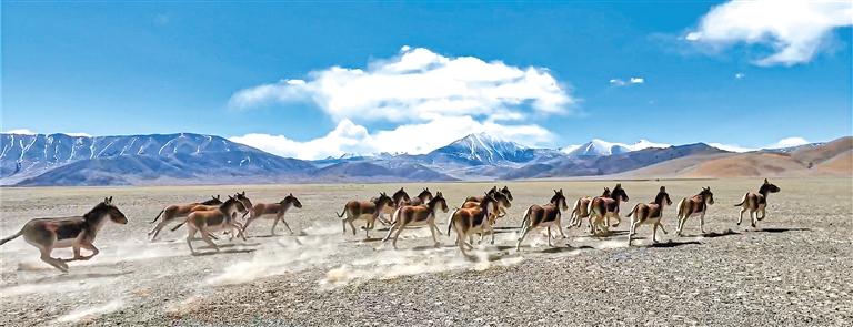 圖為在羌塘國(guó)家級(jí)自然保護(hù)區(qū)內(nèi)奔跑的藏野驢。邊巴多吉 攝 記者 溫凱 永青 洛桑旦增