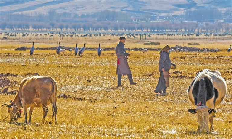 卡孜濕地是其中一個(gè)投食點(diǎn)?,F(xiàn)年43歲的洛桑次旦就住在附近,每天一大早,他都會(huì)到卡孜濕地放牧。“‘鄰居’越來越多了,十幾年的時(shí)間,黑頸鶴的數(shù)量從幾只增長到幾百只?!甭迳4蔚└嬖V記者,黑頸鶴和牛各吃各的,互不干擾,非常和諧。