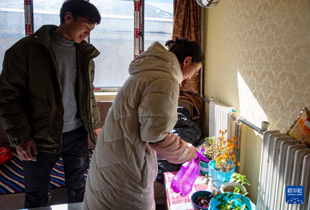 距離太陽能集熱場約3公里外的縣職工周轉房小區(qū)是供暖工程的最遠端,年輕夫妻曲珠(左)和央次仁在家中侍弄花草(1月6日攝)。新華社記者 姜帆 攝