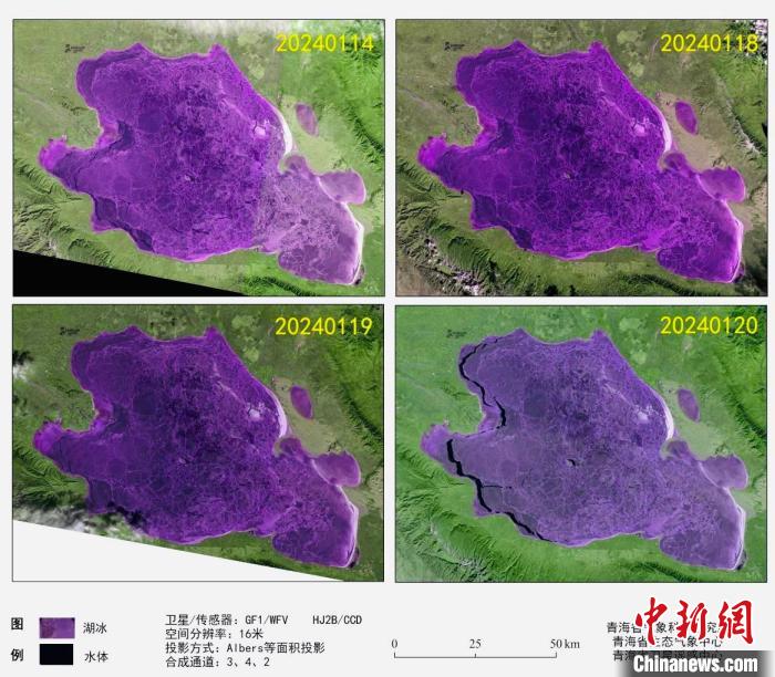 據(jù)介紹,衛(wèi)星遙感監(jiān)測顯示,1月14日、18日、19日,青海湖湖泊表面完全凍結(jié),依據(jù)《高原湖泊湖冰物候遙感監(jiān)測技術(shù)標準》(DB63/T1929-2021),湖泊表面連續(xù)5日完全被冰覆蓋的首日為完全凍結(jié)日,因此判定1月14日為青海湖完全凍結(jié)日。